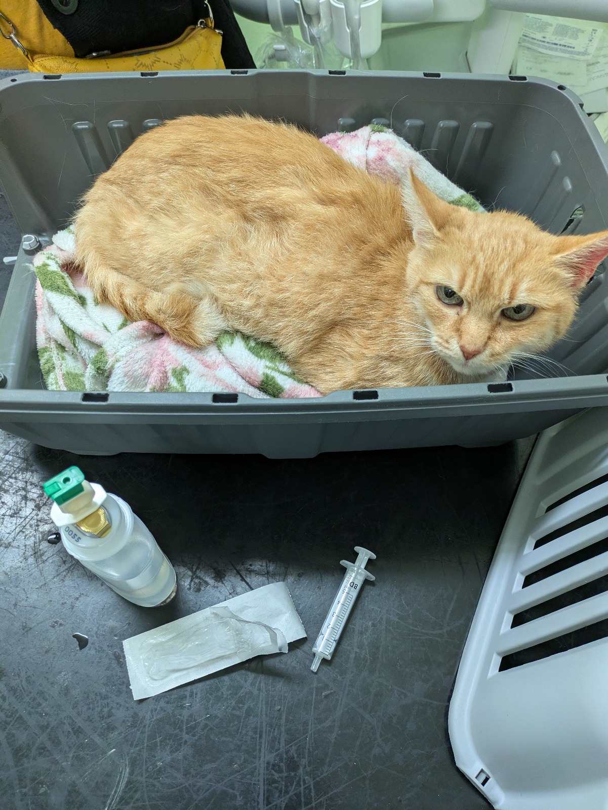 Losínka zranila sekačka při kosení luk. Kocourek je v šoku a noha neslučitelná se záchranou. Ihned dostal veškeré potřebné medikamenty a podstoupil amputaci. Nyní je v naší péči na rekonvalescenci.
