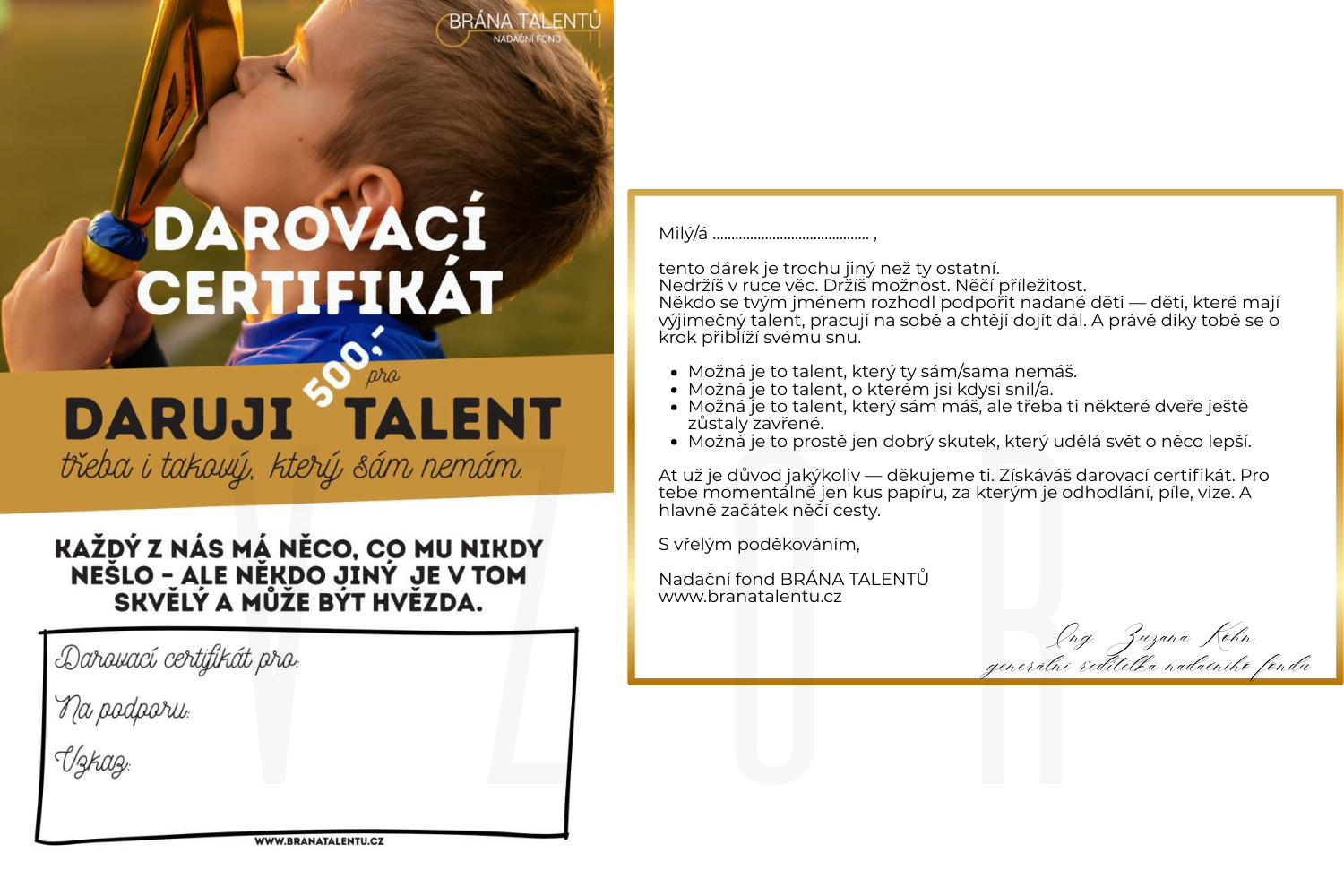 Máte zájem o DAROVACÍ CERTIFIKÁT? Podpořte náš projekt a my vám ho do mailu zašleme. Můžete si ho nechat pro sebe, nebo ho právě někomu darovat.