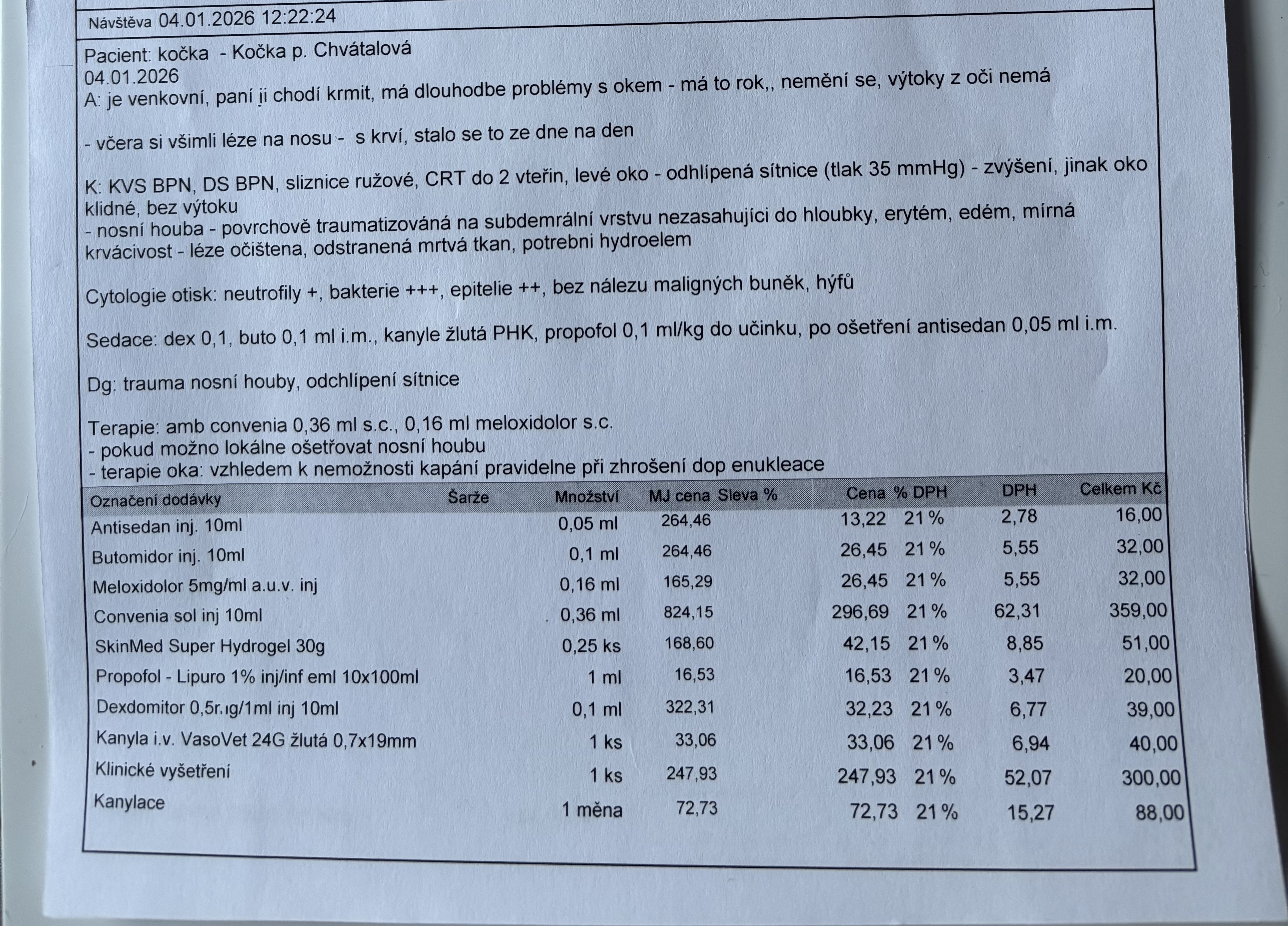 4.1. Kočička z krmného místa s poraněným nosem převezena na pohotovost. Ošetřena, nosík se hojí. Částka za ošetření 1227 Kč- díky hodnému panu veterináři neúčtován poplatek za pohotovost se slovy- o kočky se málo kdo stará. ❤️🩹 Velice děkujeme za ošetření, profi přístup k plachému zvířeti a ohleduplnost. Doporučeno vyndání levého oka při problémech. 😿 Klinika Piketa