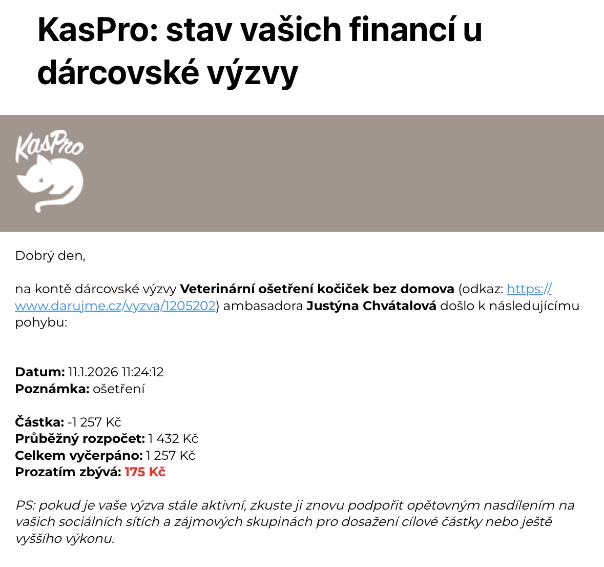 Děkuji Vám z celého ❤️ za pomoc s úhradou veteriny pro kočičky bez domova. 🙏