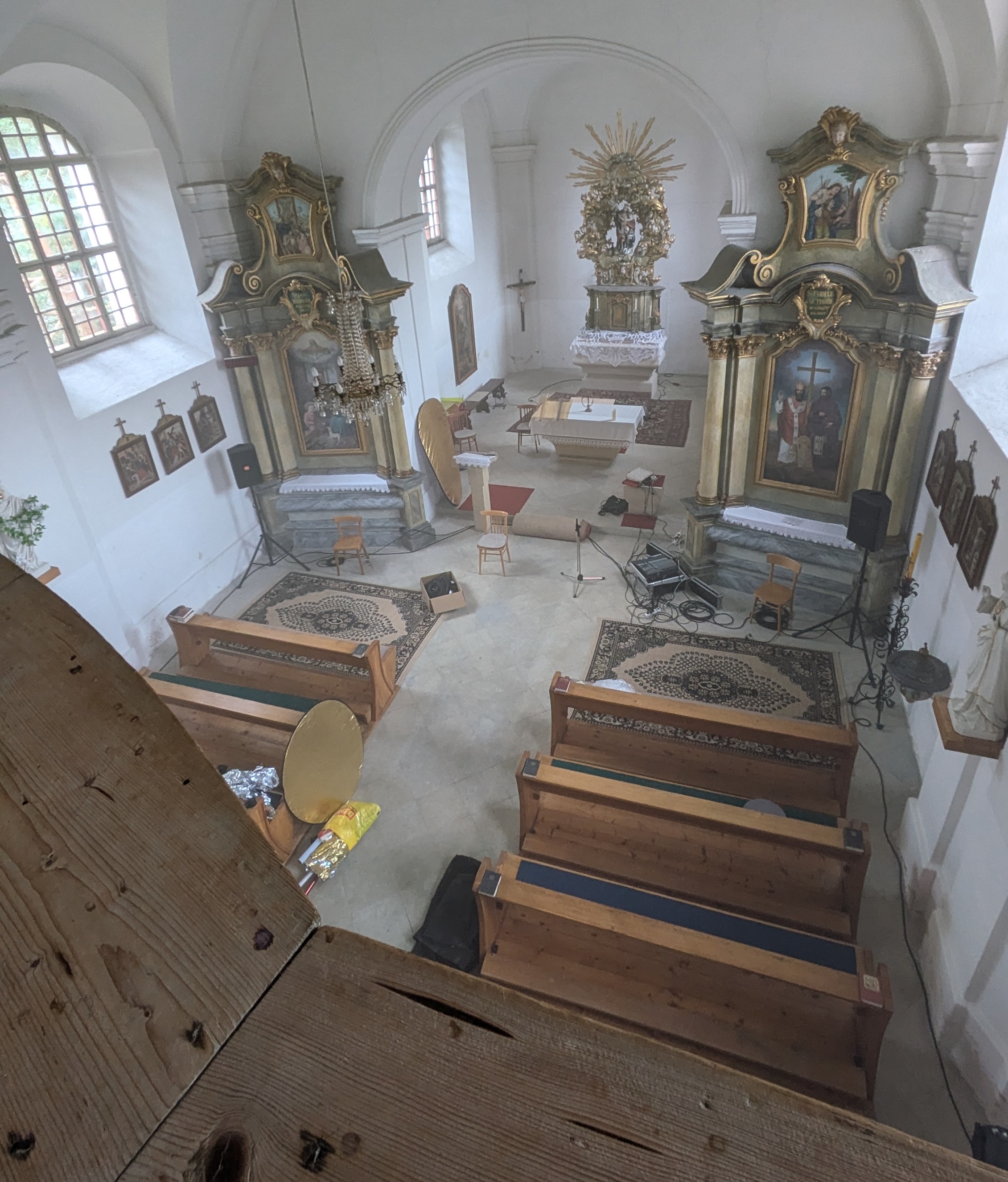 Naší každoroční větší akcí v kostele je také audivizuální projekt na svátek svatého Václava (viz facebook), do kterého zapojujeme buď jako interprety, účastníky, nebo jako pomocníky naše přátele a sousedy z okolí. Akce vždy nějak souvisí z lokální historií (film o pečení chleba), nebo se spiritualitou místa (koncert mladé místní houslistky, umělecké instalace) a vždy jí vnímáme hlavně jako fúzi různých sociálních "bublin". Letos jsme si dali za téma "vrátit" do naší obce čas a rozhýbat hodiny, které už léta nefungují. S motivačním heslem: "čas je tu pro všechny" jsme začali jednat z obcí, církví, hodináři atd...a zjistili, že to bude dlouhá cesta....